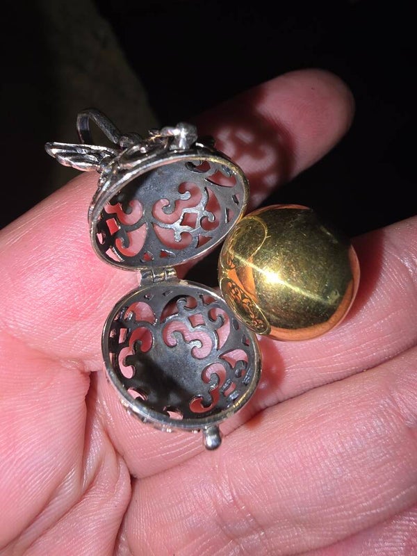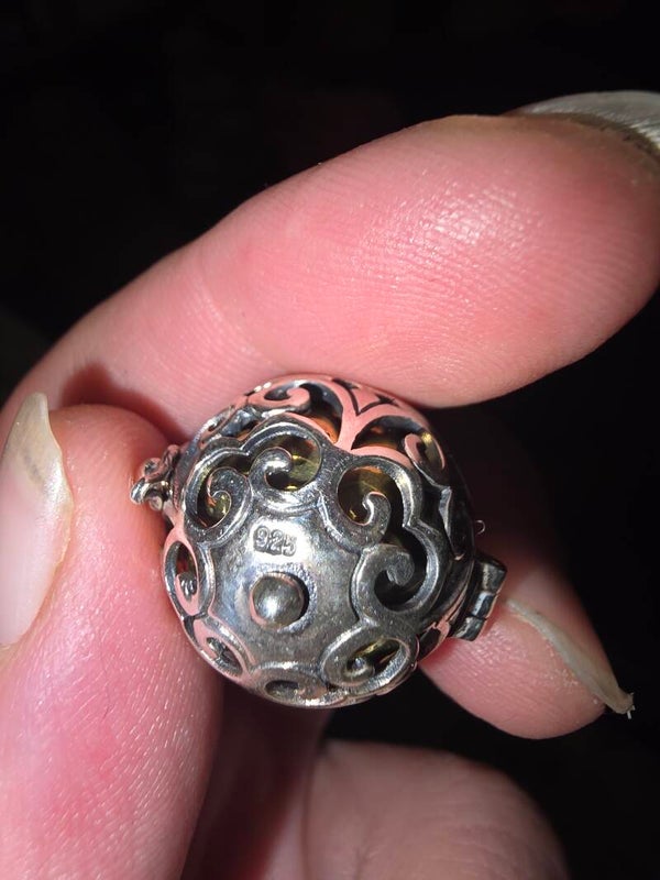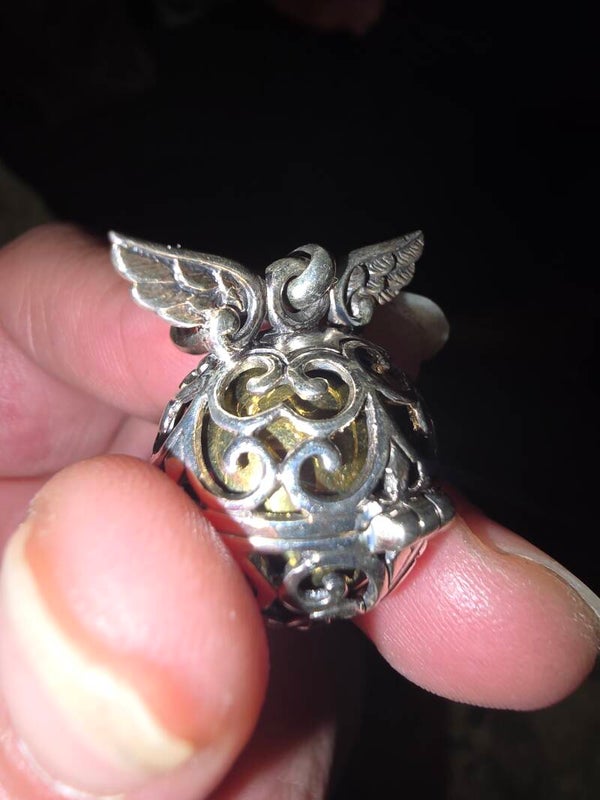 Verkaufe einen Engelsrufer-Anhänger in hochwertigem Silber. Das Schmuckstück ist neu und ungetragen, mit einem aufwändigen, filigranen Ornamentmuster und geschwungenen Flügel-Details. Passt ideal an eine Kette oder kann als auffälliger Anhänger getragen werden.